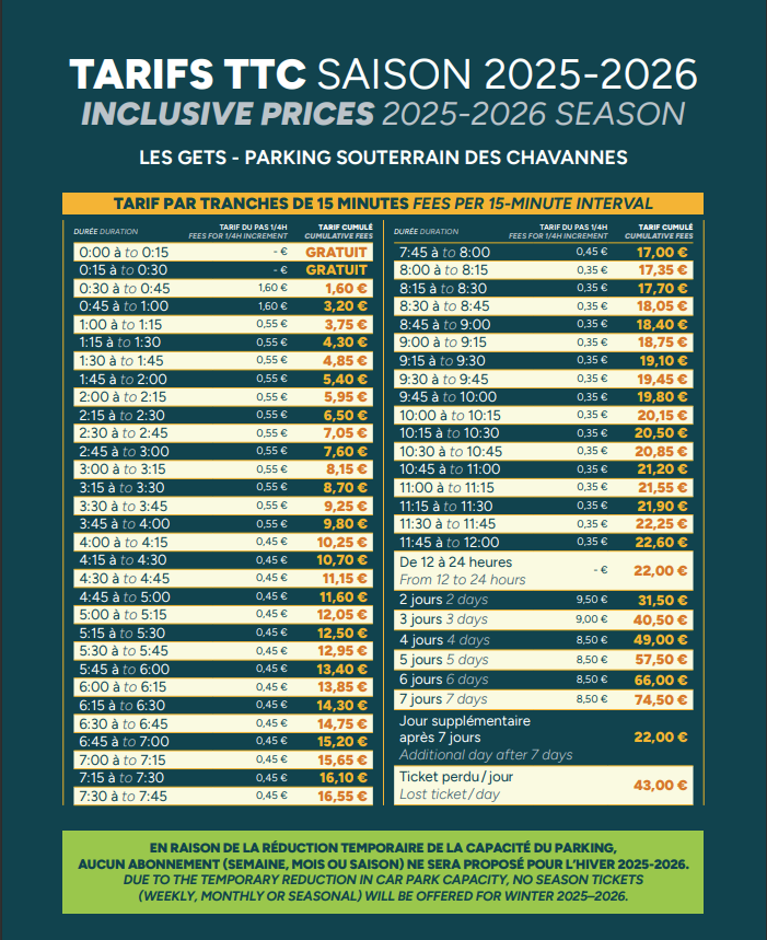 Ideally located in the heart of the village at the foot of the pistes, under the Chavannes cable car. Free in summer, chargeable from 15 December 2025 to 12 April 2026. Payment by credit card directly at the exit barrier.