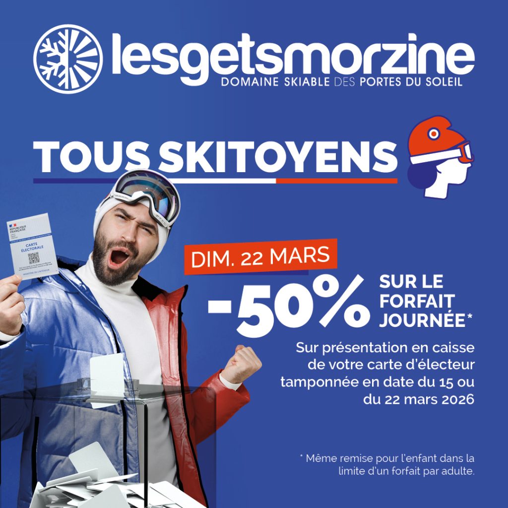 Tarif promotionnel pour forfait 1 jour Les Gets-Morzine daté du dimanche 22 mars 2026. Sur présentation en caisse de la carte d’électeur tamponnée en date du 15 ou du 22 mars 2026 ou d’une procuration valide. Dans la limite d’un forfait journée Morzine-Les Gets à prix réduit délivré par carte d’électeur tamponnée. Forfait enfant avec même remise que l’adulte dans la limite d’un forfait enfant par adulte. Carte mains libres et assurance non comprises.